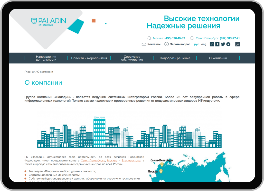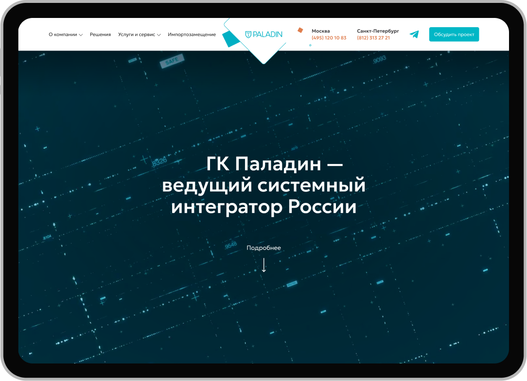 Однако предыдущий сайт не отражал масштаба и зрелости бренда: устаревший визуальный язык, неудобная навигация и слабая структура затрудняли привлечение новых клиентов и не формировали должного уровня доверия. Мы поставили перед собой задачу создать современную цифровую платформу, которая честно передаёт характер Паладина — технологичный, открытый и ориентированный на результат. Новый сайт стал понятным и функциональным пространством, демонстрирующим экспертность компании и укрепляющим коммуникацию с аудиторией.